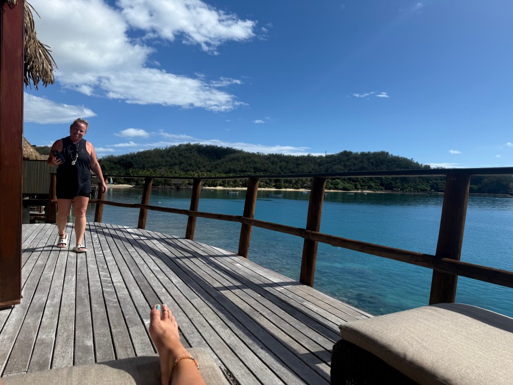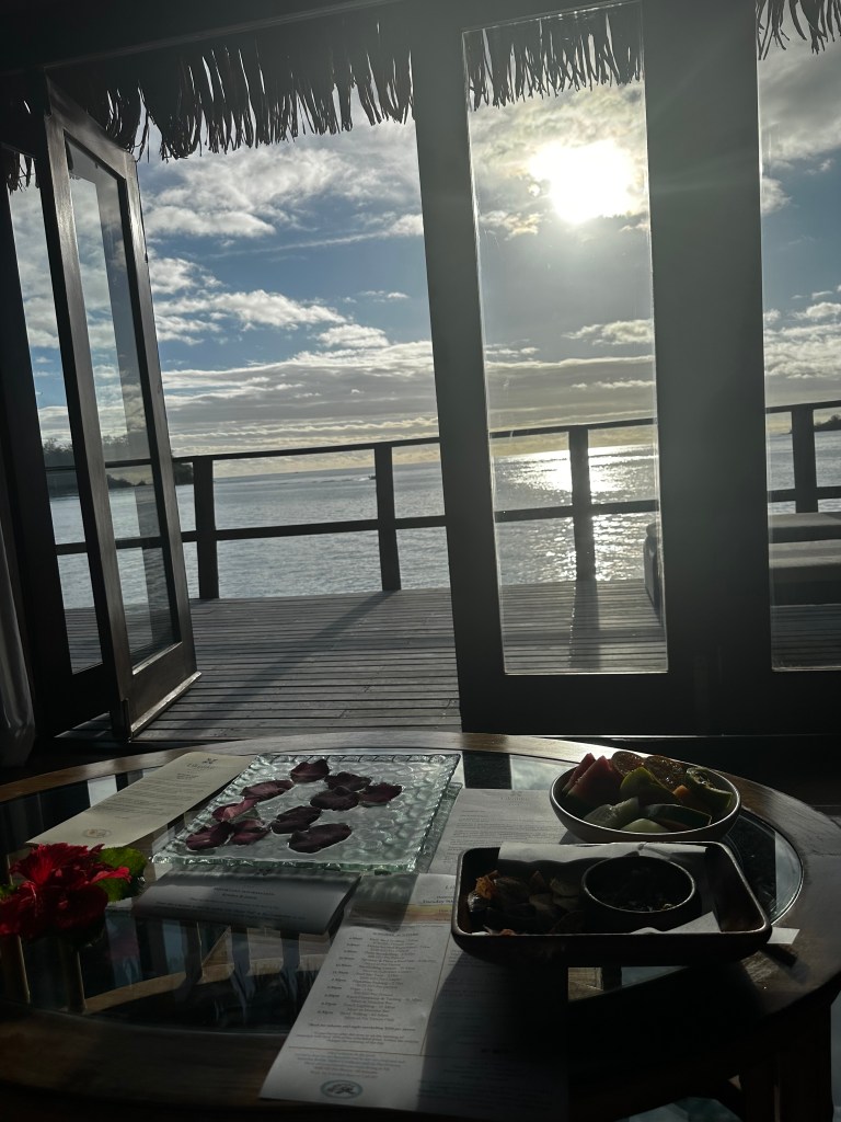 The arrival felt almost cinematic. We were greeted with a local song, soft guitar, a handmade necklace, and a warm welcome that immediately erased the previous night’s airport chaos. From there, we were escorted to our overwater bungalow.