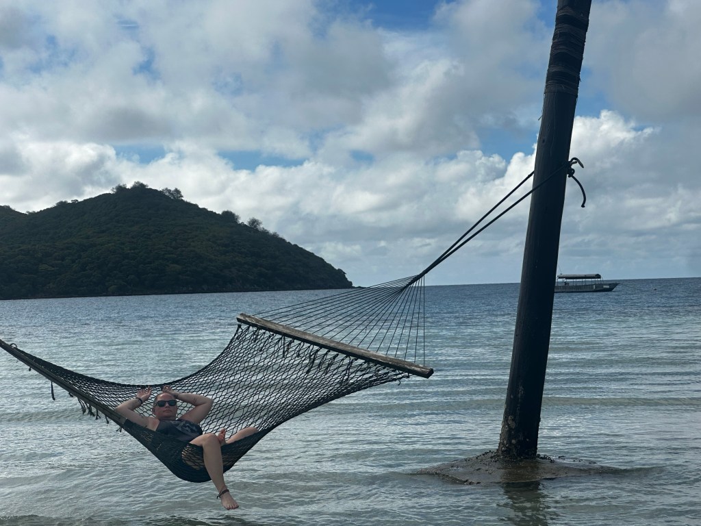 The next morning, we walked down to the port to catch our ride to paradise. The trip to our island took about two hours, mostly because the ferry stops at multiple islands, dropping people off and picking others up like clockwork. The passengers were a mix of locals, tourists and even packages that were mailed from the mainland. They have boat logistics down to an art form. It takes minutes for the large water tax to stop about 200 feet from shore, announce the island and get transferred fairly quickly to an onto a dinghy, almost literally tossing us aboard. Minutes later, we pull up to our ocean resort, Likuliku (Lee Ku Lee Ku).